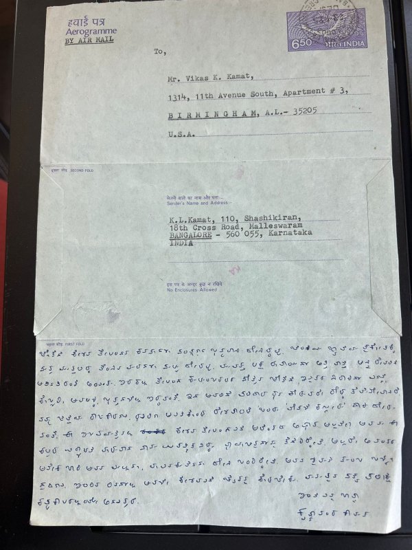 Who will understand my agony of throwing away thousands and thousands of letters between my parents when my mom died? Fans of my father already know this -- my dad was a fantastic letter writer. And because our family was distributed in many cities, he wrote lots of them -- this was at a time phones were not available. My father also wrote lots of letters to me. They are world class literature (my father had PhD from SUNY, he was a scientist, anthropologist, artist, paleontologist, entomologist, photographer, archeologist, historian, and a popular writer in Kannada language), and in fact some folks have accused him that he wrote these letters in the hope/knowledge that one day, they would be published. That accusation however is not true -- they are indeed personal letters and why I had to destroy them. After I destroyed them, my archivist friends regretted --"Vikas, after 200 years when all of us have died, they would have remained as an authentic source of history", they said. Anyway, wanted to share a sample of a letter. See how meticulous he is --the letters are numbered, dated, and full return-of-investment of the aerogram with small letters!The letter itself is very beautiful -- shows as much my father's personality as the drama of the life of his friend (Keshav Telang of Mavinkurve Island). Also attaching the covers of some of his letters published as books -- "Preyasige Patragalu" (Letters to a Soulmate) -- is a very popular wedding gift item, and is always sold out.
